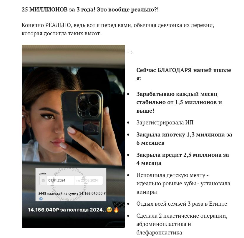 - Наставница часто убеждает учеников брать рассрочки или кредиты на оплату обучения, уверяя, что они отобьют затраты за пару дней. В реальности люди остаются с долгами и бесполезными PDF-файлами.
