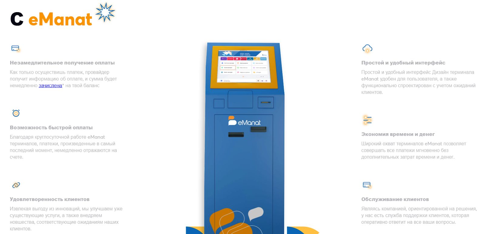 Терминалы самообслуживания Emanat, для большей части предлагаемых услуг, могут использоваться без регистрации в системе. Они располагаются в ТЦ, на вокзалах и в прочих местах с большим скоплением людей. На сайте есть возможность проводить разные виды платежей, но такая возможность актуальна только для зарегистрированных пользователей. Также есть приложение для смартфона, что открывает доступ к оплатам из любого места. Для партнеров системы созданы лучшие условия, как с минимальными или отсутствующими комиссиями, так и с небольшим количеством данных, требуемых для финансового перевода.