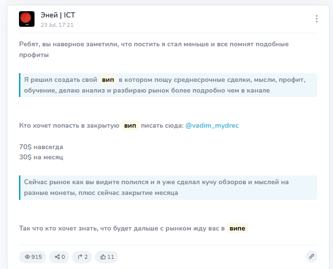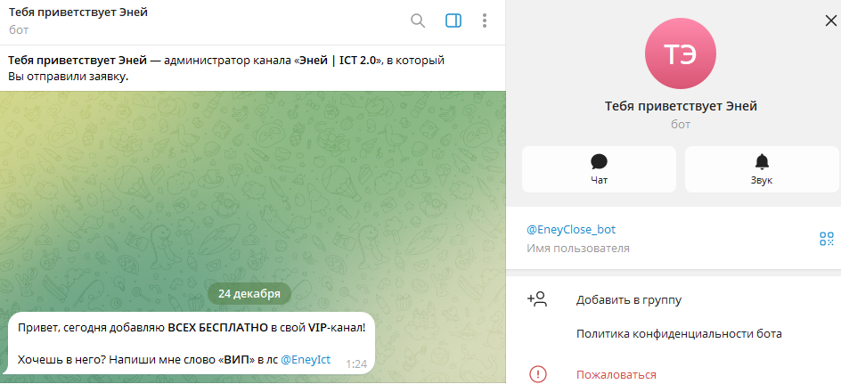 Проект представляет собой приватное сообщество. При вступлении каждому пользователю пишет бот – Тебя приветствует Эней (EneyClose bot). Он создан для продвижения бесплатного ВИП-чата от трейдера. Насколько могут быть полезны такие услуги – неизвестно.