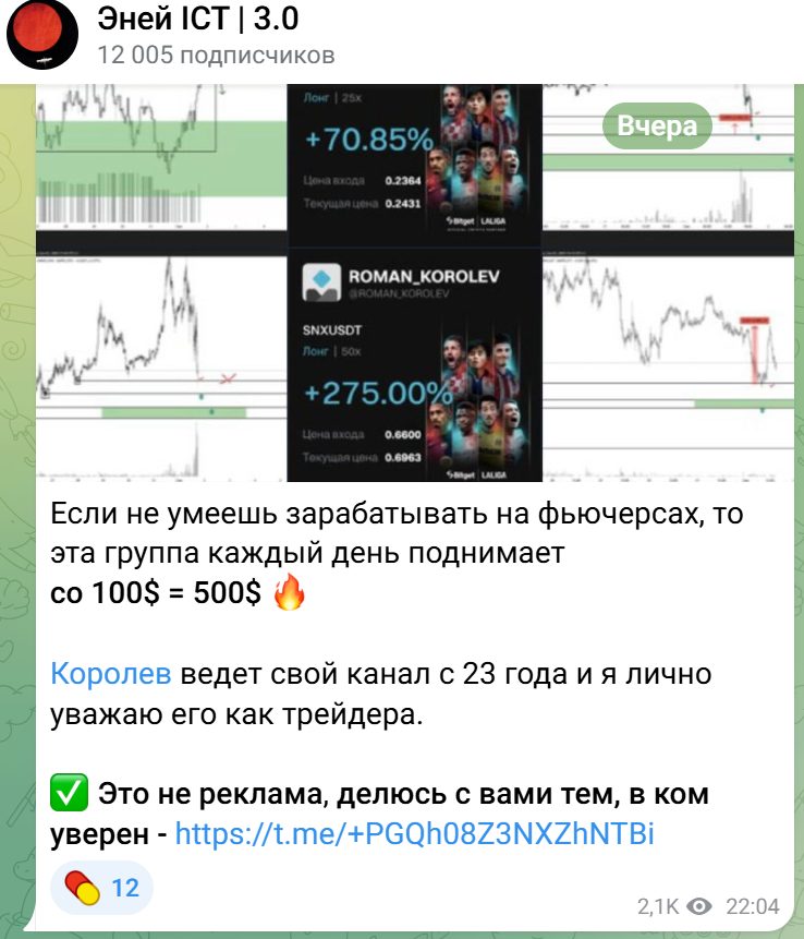 Эней ict 3 0 – Telegram трейдер, в описании канала которого значится, что вся представленная информация является отражением его личного пути, “не более”. О личности владельца проекта ничего неизвестно. Однако не спешите подавать заявку в приватный канал, пока не узнаете все подробности из нашего обзора.