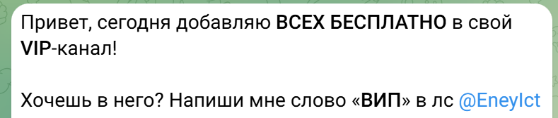 Очевидно, Эней @ eneyict не удержался от монетизации проекта через скрытые схемы. Сразу после подачи заявки пользователю пишет бот @ eneyprivet bot с предложением добавить нового участника в VIP канал анонимного трейдера. Сразу отметим, что подобные офферы на просторах Телеграмма заканчиваются уговорами подписчика зарегистрироваться в качестве реферала на сомнительной бирже. Далее по схеме следует слив депозита через сигналы от трейдера. Интерес создателя сообщества – получение комиссии от самой биржи.