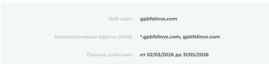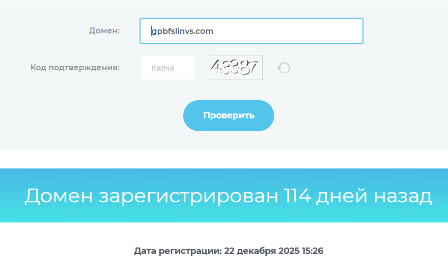 Проверка возраста домена показала, что платформа Gpbfslinvs была создана не в 2020, а в конце 2025 года. Обычно завышают срок деятельности мошенники, чтобы создать видимость надежности и повысить лояльность аудитории.
