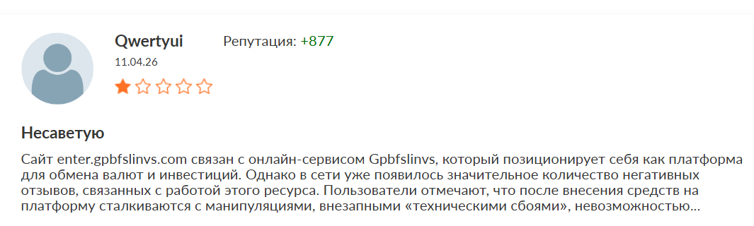 В ходе анализа Gpbfslinvs мы не нашли доказательств того, что с этой платформой кто-то потерял деньги. Это связано с отсутствием отзывов от реальных пользователей. При этом было обнаружено немало признаков, характерных для скам-бирж: