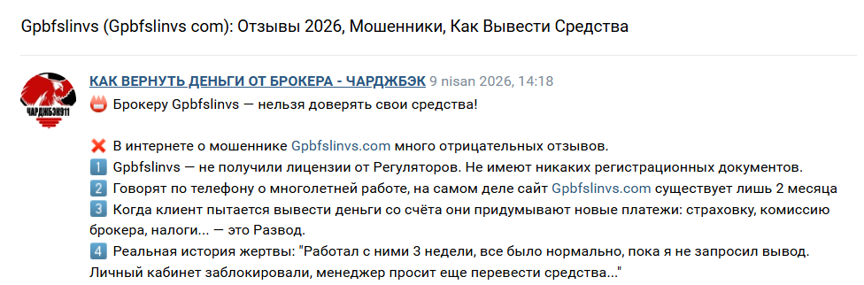 Многие мониторинговые сайты считают Gpbfslinvs мошенническим проектом. Делают акцент на нелегальной работе и блокировках при подаче заявки на выплату.