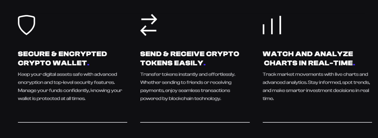 Интерфейс темный, минималистичный. Баланс показан вверху экрана крупными цифрами. Есть графики рынка в реальном времени с различными таймфреймами. Платформа отображает котировки популярных монет. Доступен криптокошелек для хранения токенов.