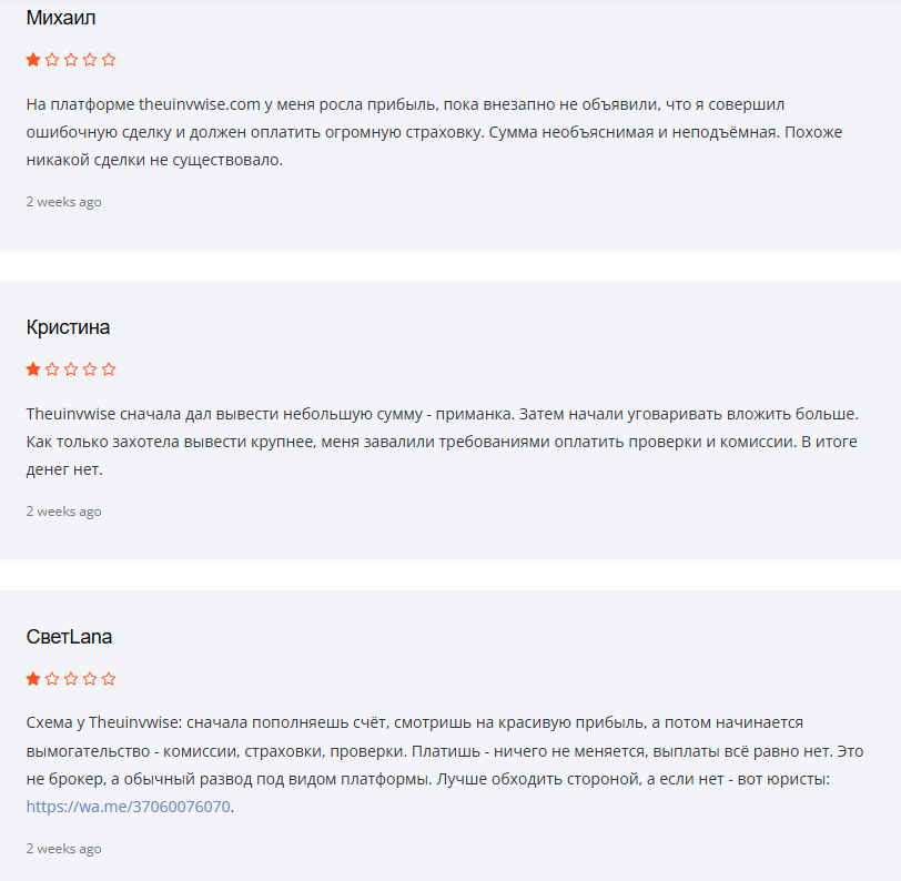 Отзывы о entrance theuinvwise com рисуют четкую картину мошенничества. Люди описывают одинаковую схему развода на всех форумах. Сначала дают вывести немного денег для доверия. Потом активно уговаривают вложить больше и заработать хорошую прибыль. Когда клиент пополняет баланс крупной суммой, начинается вымогательство.