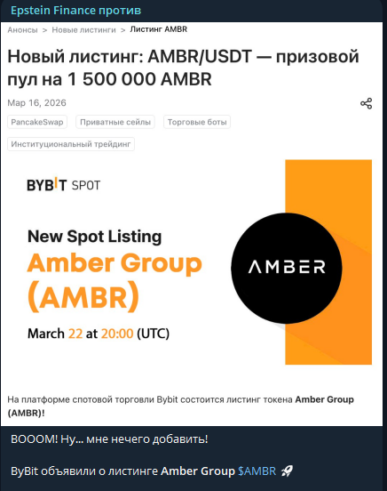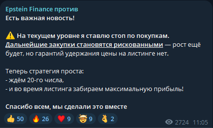 Затем в телеграмм-канале Epstein Finance выходят посты с «официальными анонсами» листингов на биржах и обещанием стремительного роста стоимости токена.