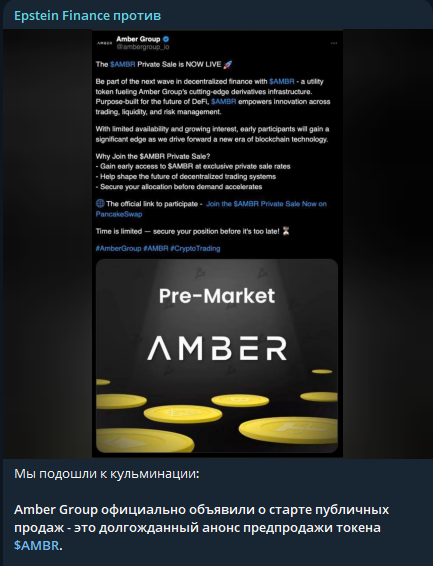 За период наблюдения канал «Эпштейн Финанс» последовательно продвигал токены $PHM, $INK и $AMBR по одной и той же системе. Когда история с токеном заходила в тупик, автор объявлял о фиксации прибыли и переходил к следующему проекту. Базовый сценарий повторялся без изменений с каждым новым токеном.