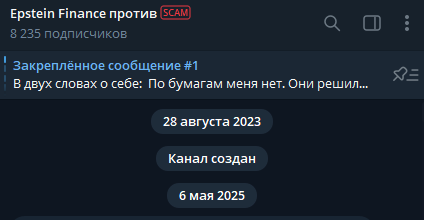 Телеграмм-канал Epstein Finance создан в августе 2023 года, однако первый пост появился только в мае 2025 года. Длительная пауза между регистрацией и стартом работы типична для каналов, которые покупают готовую площадку ради более ранней даты создания.