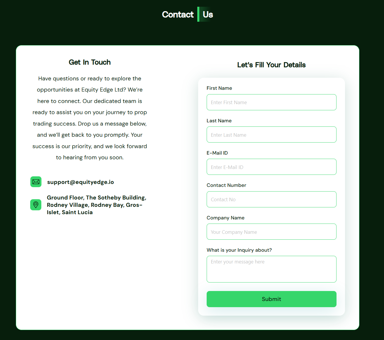 Дата регистрации Equity Edge Ltd в Сент-Люсии не указана. Однако номер фирмы с префиксом 2025 предполагает регистрацию именно в этом году. Это соответствует периоду запуска проекта как проп-трейдингового сервиса.