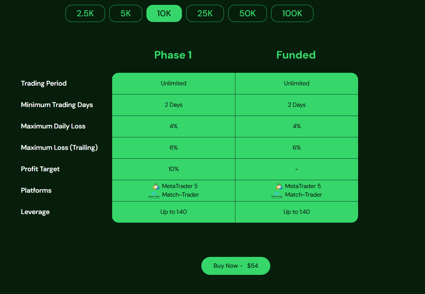 Торговля осуществляется на платформах MetaTrader 5 и Match-Trader с возможностью держать позиции во время выхода важных новостей, оставлять сделки открытыми на выходных и без жестких ограничений по времени. После прохождения оценки и KYC трейдер получает финансируемый счет.