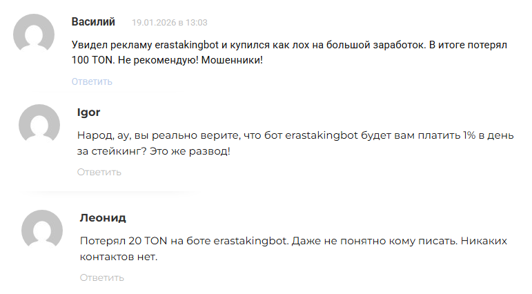 Телеграм-бот Erastakingbot представлен пользователям как инструмент для стейкинга криптовалюты TON. Разработчики обещают честные выплаты и прозрачный механизм начисления профита. Но проверка показала, что за красивыми обещаниями высокого дохода кроется опасная скам-схема. Подробности о ней читайте в нашем обзоре ниже.