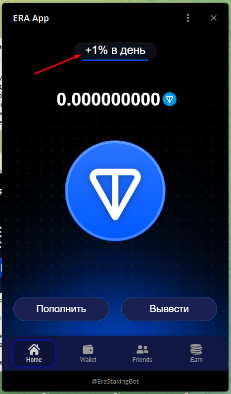 Создатели говорят, что стейкинг якобы доступен всем желающим через мини-приложение Era App в Телеграмм. Однако при проверке выясняется странная деталь: подключить TON-кошелек к платформе невозможно. Вместо этого пользователю предлагают просто пополнить внутренний баланс бота напрямую. Это полностью противоречит логике реального стейкинга и лишает пользователя контроля над средствами.