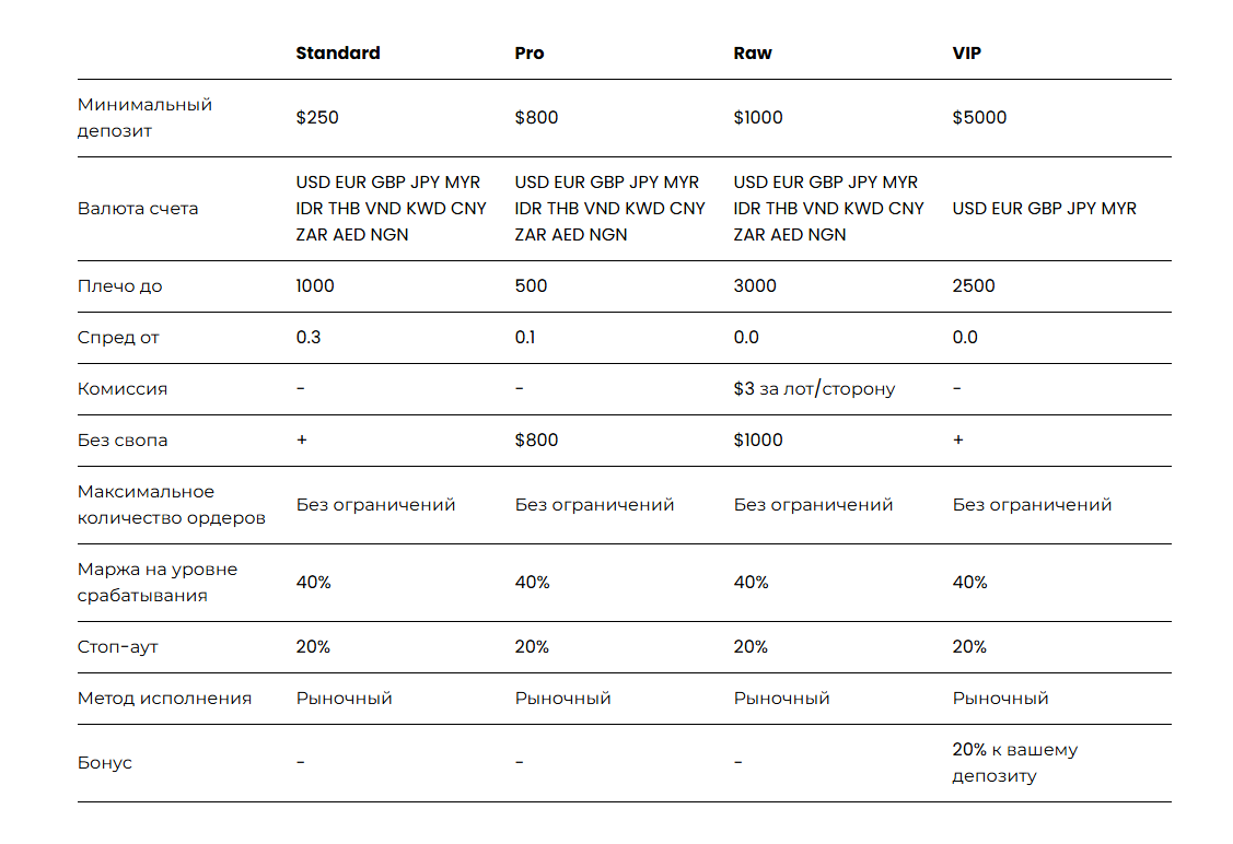Также мы обратили внимание на тарифные планы. Всего их четыре: Standart, Pro, Raw и VIP. Порог входа напрямую зависит от выбранного тарифа. Для базового счета он начинается с $250, тогда как для VIP-формата требуется уже не менее $5 тыс. Различия между счетами сводятся к торговым условиям — уровню спредов (декларируется старт от 0,3 пункта), размеру комиссий и максимально допустимому кредитному плечу.