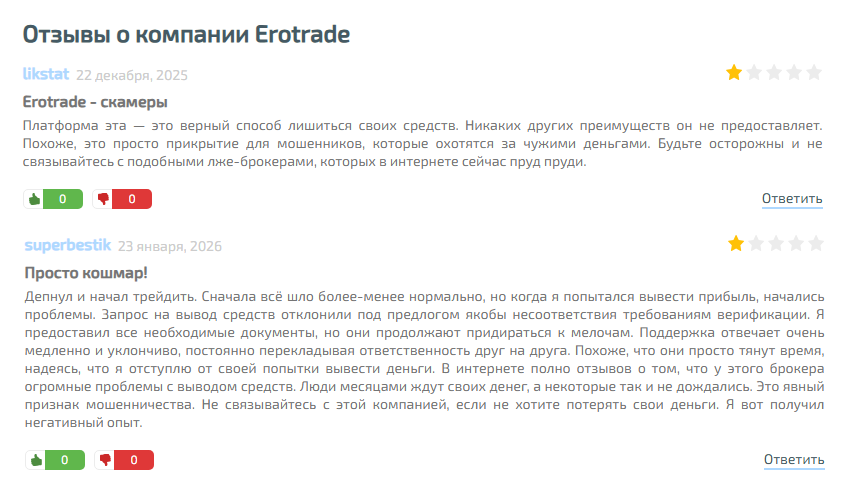 Мы настоятельно рекомендуем отказаться от сотрудничества с «Эро Трейд», это опасно для ваших финансов. Если вы работали с этим брокером, расскажите свою историю в комментариях. Больше информации о скам-проектах ищите на нашем сайте.