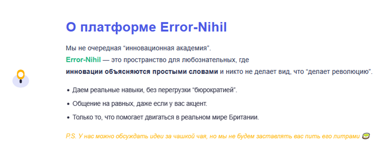 Error Nihil – онлайн-школа, предлагающая быстро научиться зарабатывать в интернете. Потенциальным слушателям обещают инновационные методы обучения, живое общение и креативность. Но нигде нет названия и описания курсов, стоимости, условий обучения. Реальные отзывы тоже не найдены, чем занимается школа – понять сложно.