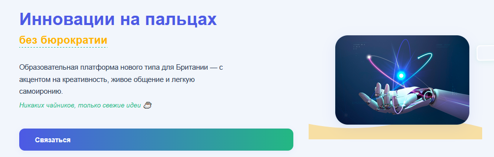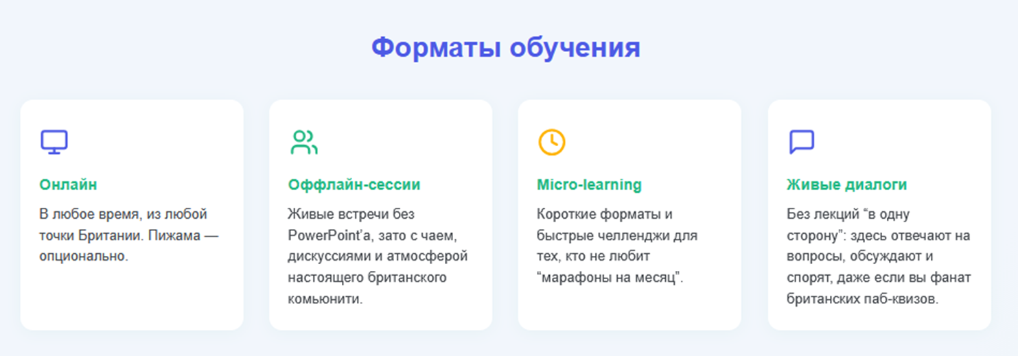 Информация об обучении крайне скудная. Заявлено, что на курсах можно получить реальные навыки, необходимые для работы в Британии. Обещают общение на равных для всех. Среди преимуществ указаны: