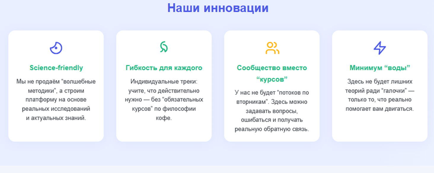 Из полезной информации – только форматы обучения. Слушателям предлагают: