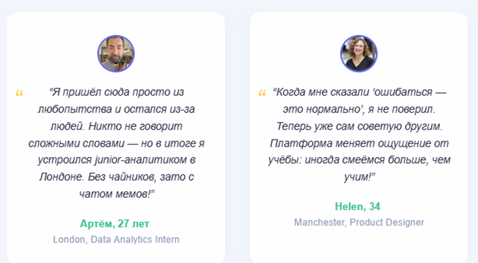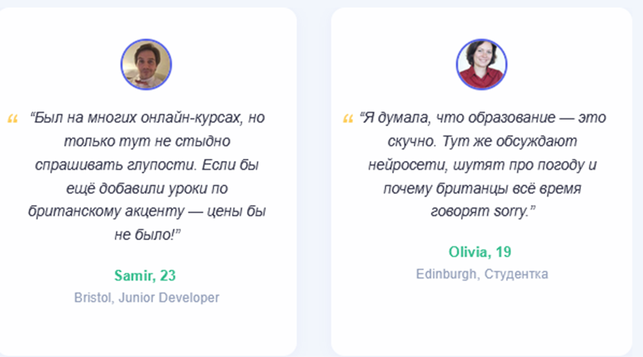 Все отзывы выглядят фейковыми, часто текст повторяет описания преимуществ самой школы. Нет никакой информации о самом обучении, длительности и эффективности. Странным выглядит и то, что все они написаны на русском языке, хотя школа заявлена как британская и базируется в Лондоне. Доверять таким отзывам не стоит.