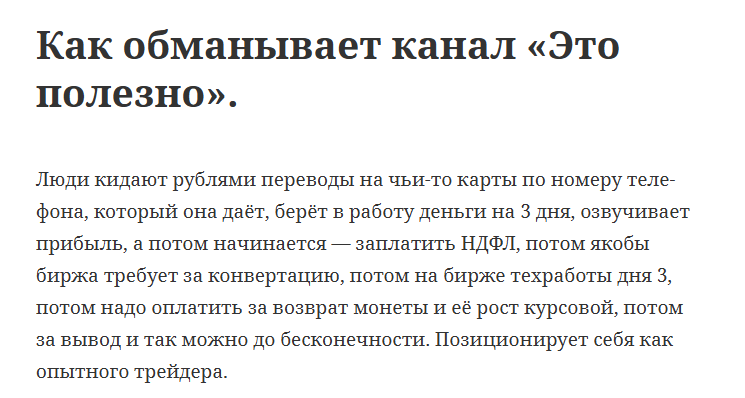 Назвать публикации в Eto Polezno полноценным контентом, как утверждают пользователи, нельзя. Вместо постов о трейдинге, аналитике и чего-либо еще. Абсолютно все записи посвящены рекламе услуг автора. Доказательствами ее честности выступают только скриншоты диалогов и переводов, которые подделать очень просто.