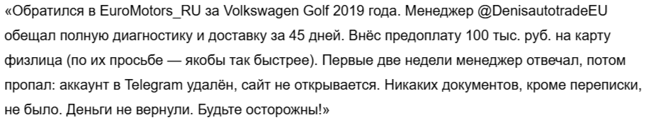 Пользователи Euromotors Ru могли столкнуться с мошенническими действиями. Сначала с них требовали предоплату без договора. Сумма была завышенной и ее нужно было перевести на карту физического лица, что считается недопустимым. После перевода представители компании просто исчезали. Они не несли ответственность за автомобили и их доставку. Пользователи оплачивали покупку транспорта, но ничего не получали.