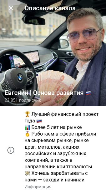 Некий инвестор Евгений в Основе Развития продвигает якобы тему заработка через криптовалютные операции, торговлю на рынке драгоценных металлов и акциях российских и зарубежных компаний. Проект анонимный: кто именно стоит за каналом, не раскрывается ни в описании, ни в публикациях. Реального имени, биографии, трек-рекорда — нет ничего. Аноним по факту.