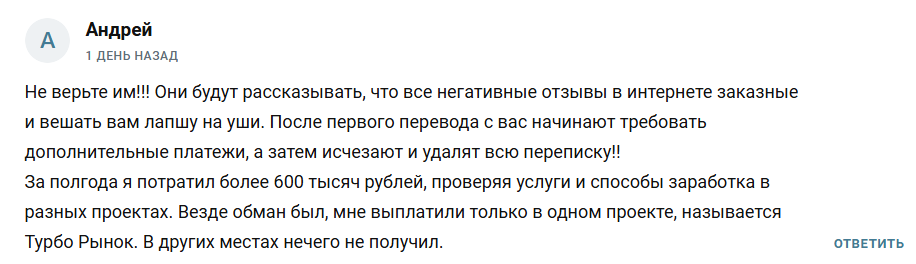 Пользователи оставляют отрицательные отклики о проекте. Один из клиентов автора канала говорит, что вложил ₽600,000, чтобы найти способы хорошего пассивного заработка. Из его слов можно сделать выводы о том, что увеличить доходы таким образом не получится, так как всюду одни мошенники.