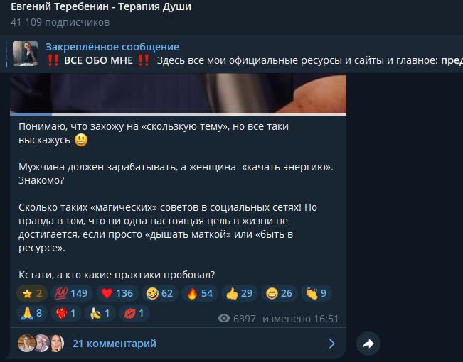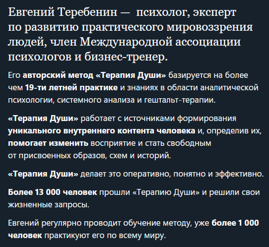 Для начала стоит разобраться в регалиях: полноценной личной биографии Евгения Теребина нет, но есть несколько заявлений и публикаций. По сути, все достижения автора умещаются в один пост, а их основную часть нельзя проверить. Допустим, психолог утверждает, что практикуется уже более 19 лет, но подтвердить это никак не может. То же самое касается и заявлений о 13+ тыс. учеников.