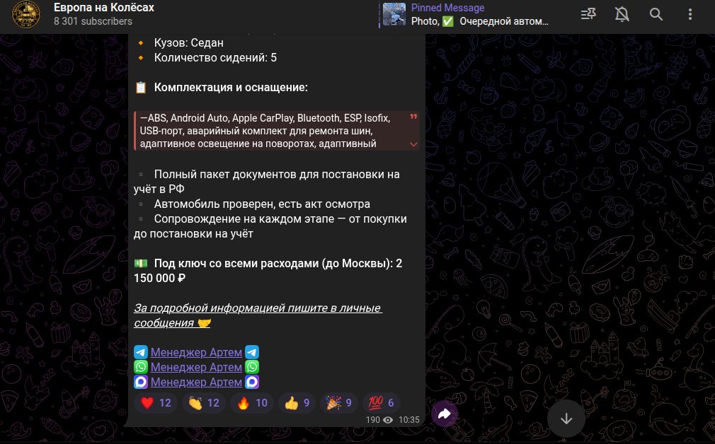 В пакет еще включена транспортировка. Доставка возможна прямо до Москвы. Однако, машину по итогу никто не получит. Менеджер маркетплейса заявляет про необходимость предоплаты якобы за резерв транспортного средства. Если подписчик телеграмм-канала «Европа на Колесах» платит, тогда менеджер придумывает еще услуги. Такой процесс идет до тех пор, пока у клиента не будет нуля на банковском счету. После обнуления баланса команда проекта отправляет подписчика в бан.
