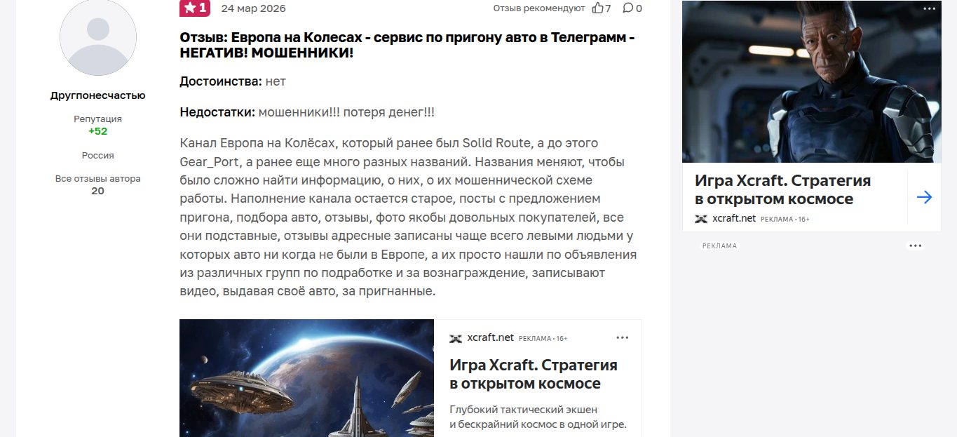 Положительных откликов об интернет-магазине нет. Об автомобильном сообществе в целом не так много фидбеков. Мы нашли только негативные отзывы о канале в телеграме «Европа на Колесах» про скам на депозитах и развод под видом продажи автомобилей.