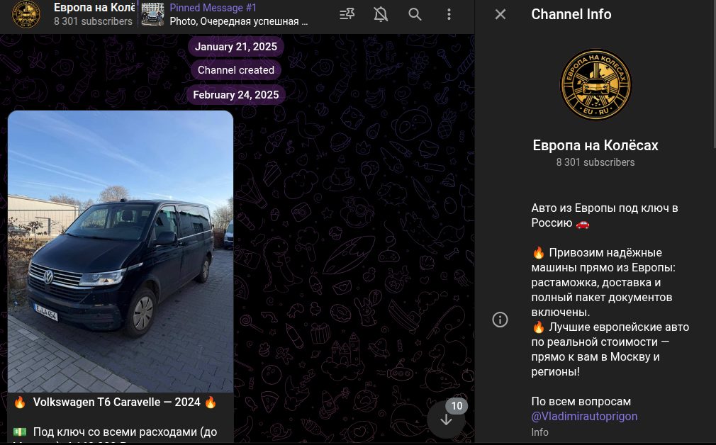 Старт телеграм-канала по продаже автомобилей был 21 января 2025 году. В первом посте команда рассказала про очередной автомобиль. На этот раз разработчики магазина представили иномарку Volkswagen T6 Caravelle. В описании сообщества менеджеры пишут, что телеграмм-канал «Европа на Колесах» — надежный магазин.