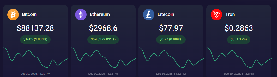 Ниже главного экрана показаны курсы популярных криптовалют. Больше никакой актуальной информации нет, что выглядит очень странно. Будто это обрезанный одностраничник, на котором должно быть больше данных.