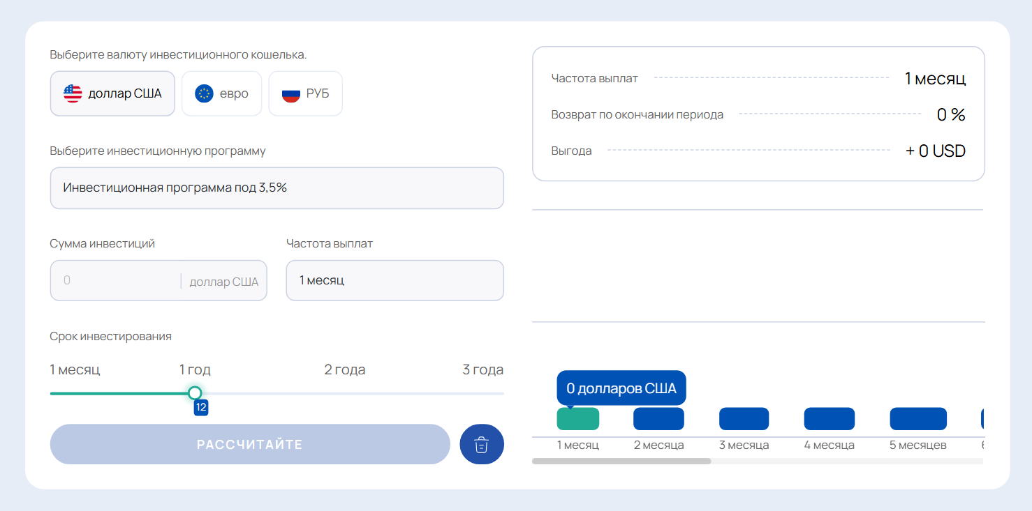 Помимо трейдинга клиентам предлагается инвестиционная программа. Процентная ставка –3,5% годовых. Срок вклада от месяца до 3 лет. Минимальная сумма взноса не обозначена. Подробной информации об этой программе нет. Куда идут деньги инвесторов, непонятно.
