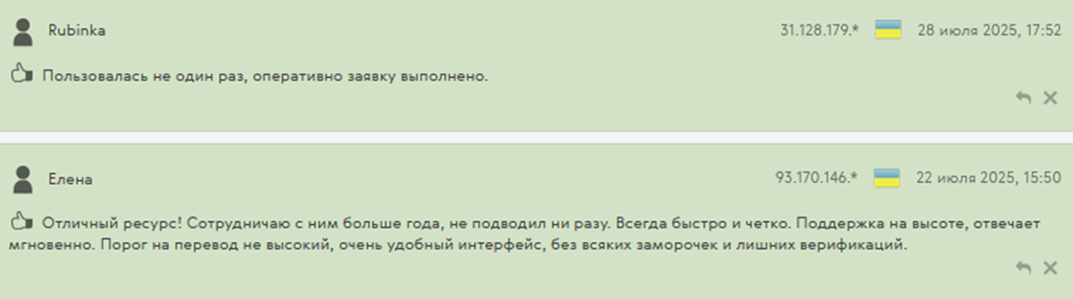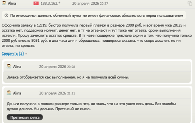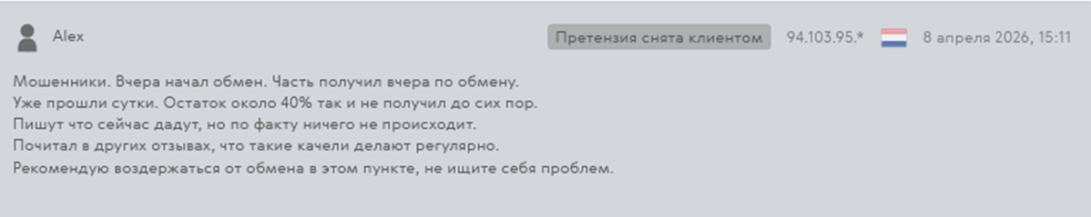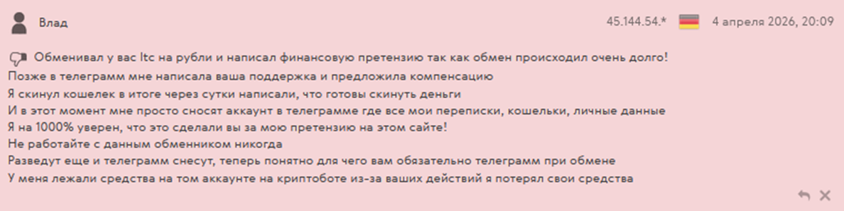 Есть и отрицательные отзывы. Некоторые пользователи говорят, что из-за затянувшегося обмена администрация предложила компенсацию. По словам одного из клиентов ему сказали о такой выплате, но тут же аккаунт в ТГ, где велась переписка, был снесен. Он обвинил в этом сервис, хотя никаких доказательств нет.