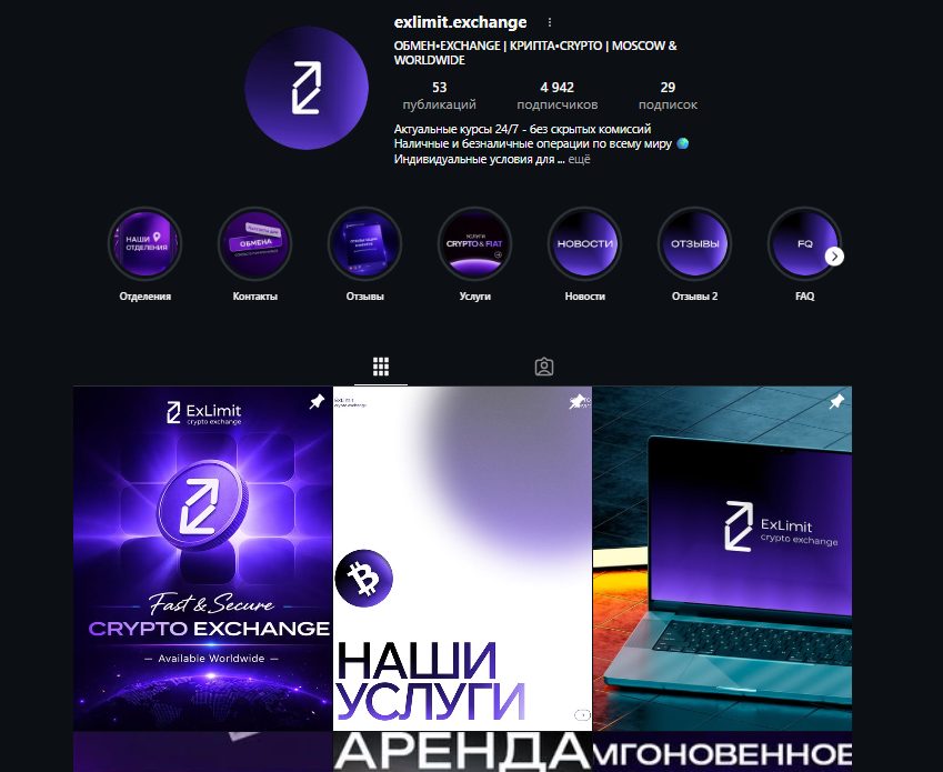 Мы определили, что еще в начале апреля на канал было подписано более 4 000 человек, поэтому можно судить об отрицательной динамике. Также поддерживать «контакт» с обменником ExLimit exchange можно через профиль @exlimit.exchange в «Инстаграме», на который подписаны почти 5 000 человек.