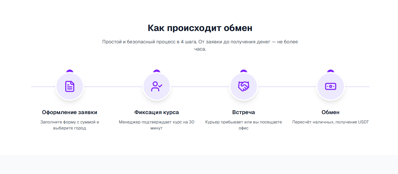 Чтобы произвести обмен онлайн, не обязательно раскрывать свои личные данные, ведь процесс не отличается от других сервисов. Для получения наличных предлагают оформить заявку, зафиксировать курс и встретиться с курьером, чтобы на месте перевести ему криптовалюту и получить деньги.