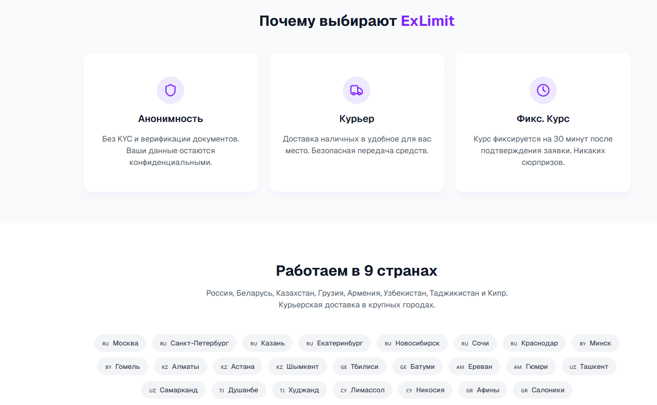 Основную информацию можно получить на главной странице обменника ExLimit exchange, где написано, что сервис доступен в 9 странах, а доставка наличных производится через курьерскую службу с фиксированным курсом.