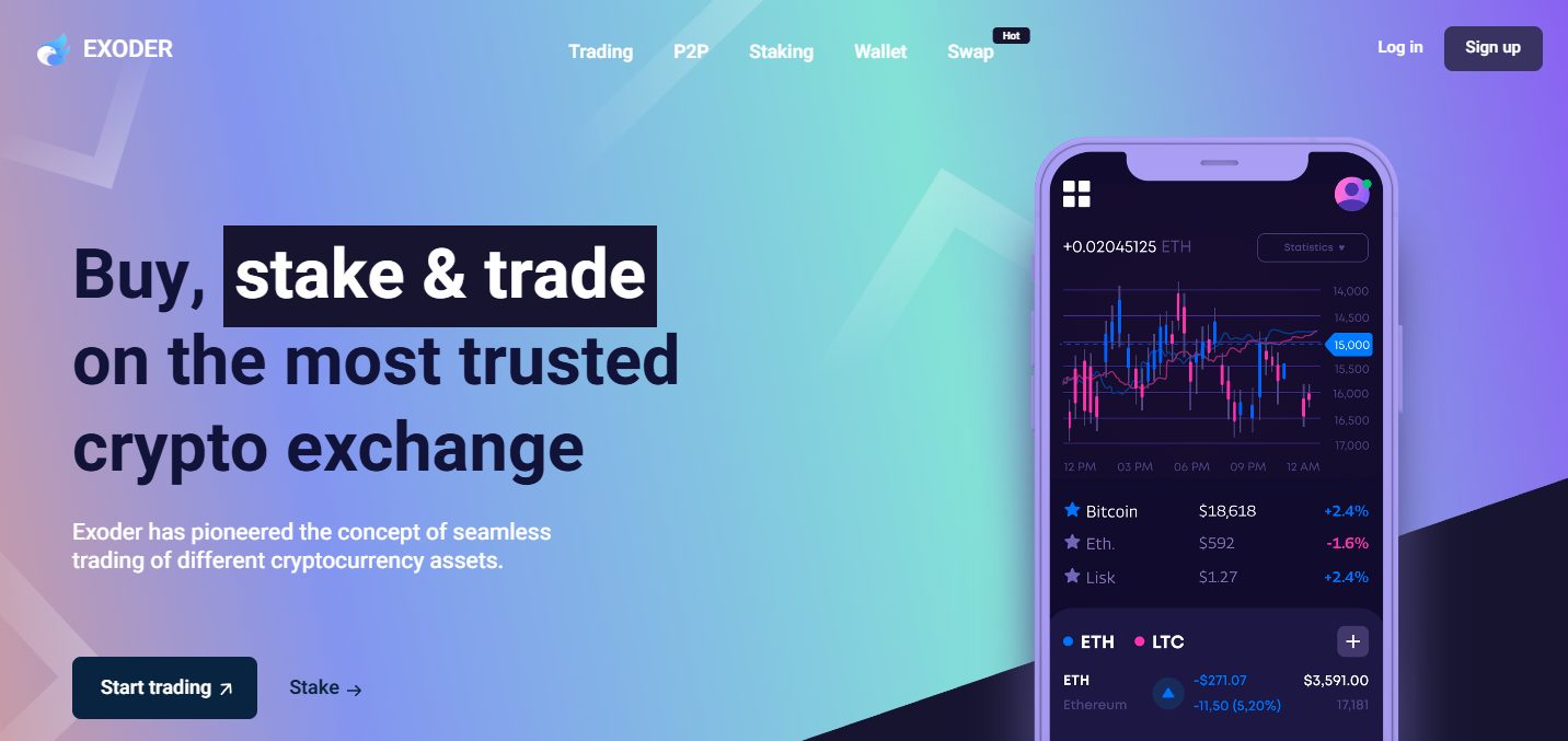 Exoder – это очередной клон сомнительной сети криптообменников, которые объединяет один слоган Buy, stake & trade on the most trusted crypto exchange. Все подобные криптобиржи оформлены примитивно, не содержат информации об их разработчиках или условиях защиты инвесторов.