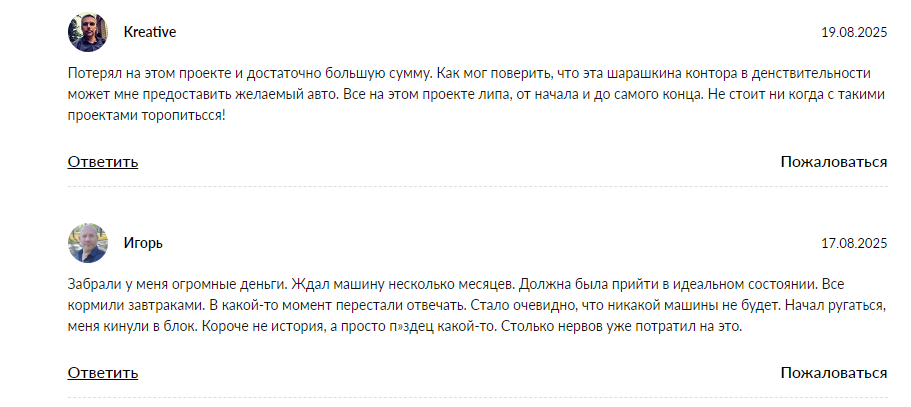 Ни одного реального подтверждения того, что канал действительно пригнал хоть один автомобиль, не обнаружено. Клиенты также отмечают следующие проблемы: