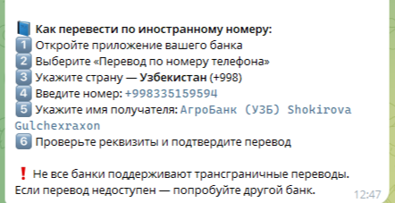 Мы выполнили все шаги и получили номер для перевода денег. Владельцем реквизитов выступает частное лицо из Узбекистана. Следует помнить, что перевод денег анонимным лицам связан с высоким риском потери активов. Как правило, после перечисления ничего в ответ не приходит, а деньги жертвы становятся добровольным донатом.