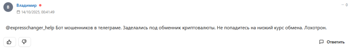 Проанализировав независимые ресурсы, мы поняли, что валютник практически никто не обсуждает. Однако нашли обзор проекта на одном из сайтов, где автор пишет, что криптообменник принадлежит аферистам и у проекта есть несколько сайтов. Под статьей один из читателей оставил отклик, в котором написал, что Express Changer — это обман и развод на деньги. Разработчики бота мошенники и доверять им нельзя.