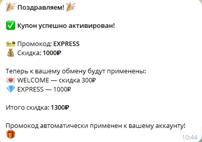 В телеграмм-боте, после нажатия на кнопку «Старт», пользователей сразу встречает приветственное сообщение. В нем администраторы проекта пишут, что их валютник лучший и отличается от аналогичных ресурсов. В посте дополнительно сообщают о приветственном бонусе под названием WELCOME в размере 300 рублей на первую операцию. Далее организаторы предлагают еще один промокод с бонусом EXPRESS в размере 1000 рублей. В сумме клиент получает выгоду на 1300 руб., а купон активируется автоматически.