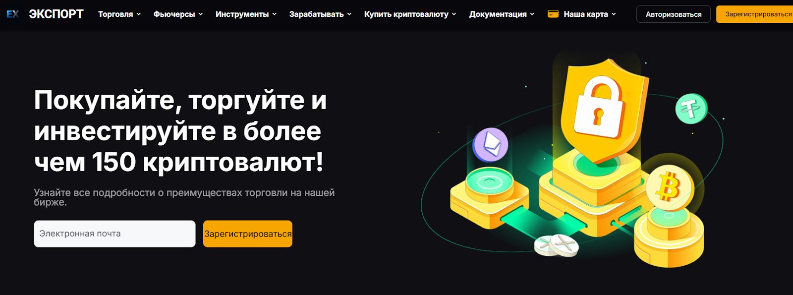 Платформа Exvort com имеет интерфейс лишь с поддержкой английского языка, что сразу же не соответствует лидерским заявлениям. Авторы обещают предоставлять возможность для трейдинга более 150 криптовалютами. В качестве способов пополнения и вывода значатся банковские карты и популярные токены, включая стейблокины.