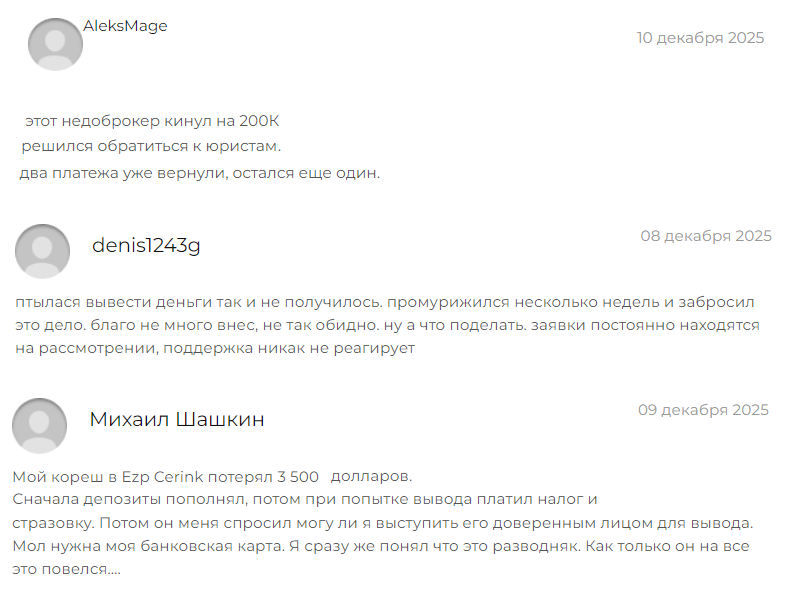 - в сети пользователи оставляют отрицательные отзывы о мошенниках из Ezupicerink.