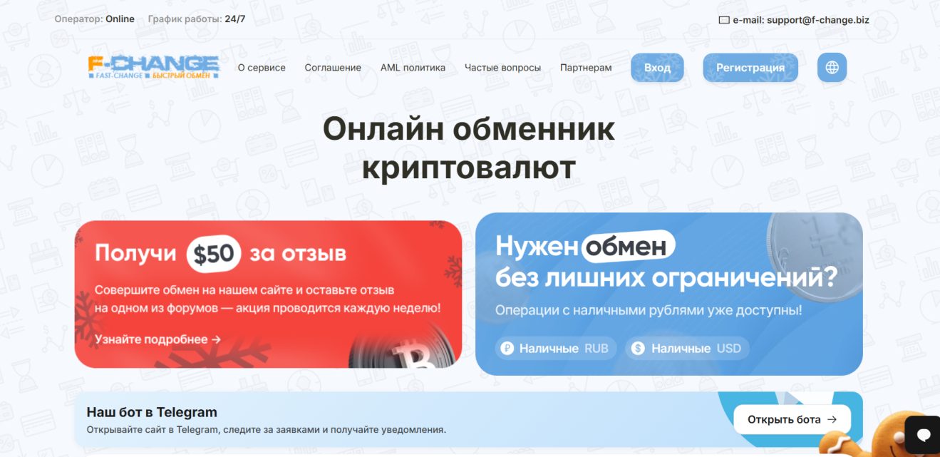 Исходя из статистики, на этой неделе было совершено более 700 обменов, а в месяце свыше 2.3 тыс. У проекта есть партнеры: Глазок и BestChange. Для связи с менеджерами есть электронная почта Support f change biz.