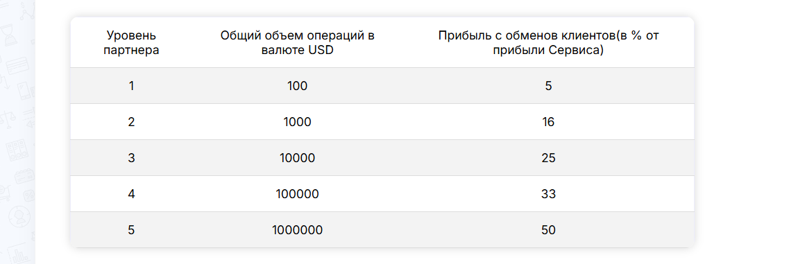 - 1 уровень. При общем объеме операций в 100 USD прибыль с обменов 5%;
