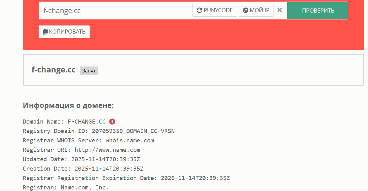 Кто выступает разработчиком обменника, неизвестно. История развития проекта не опубликована. Мы проверили домен веб-ресурса, и он зарегистрирован в ноябре 2025 года.