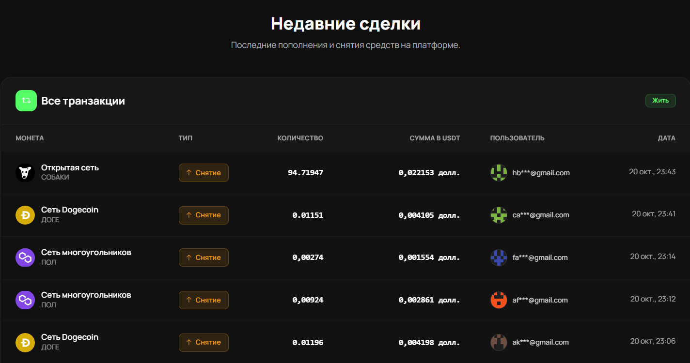 Главная страница демонстрировала впечатляющие цифры. Более 10 тысяч активных пользователей. Постоянно обновлялась лента транзакций с пополнениями и выводами. Все выглядело как процветающая площадка.