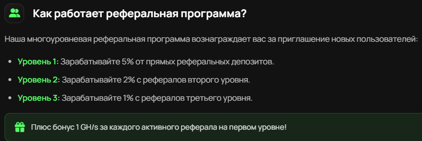 Реферальная программа работала по трем уровням. 5% с первого уровня, 2% со второго, 1% с третьего. Плюс бонус 1 единица хешрейта за активного реферала.