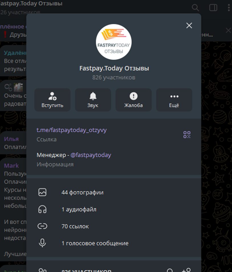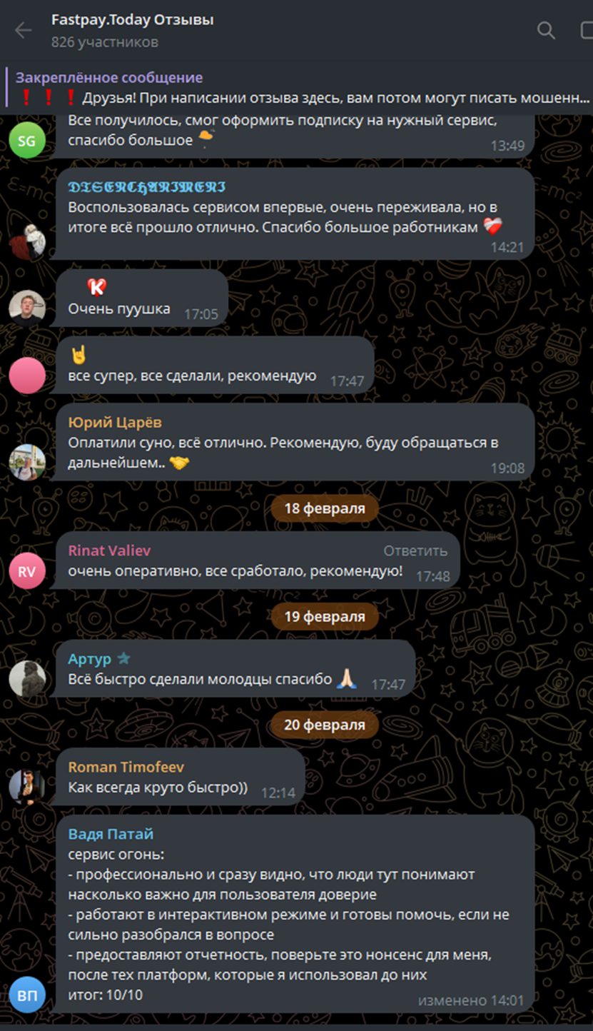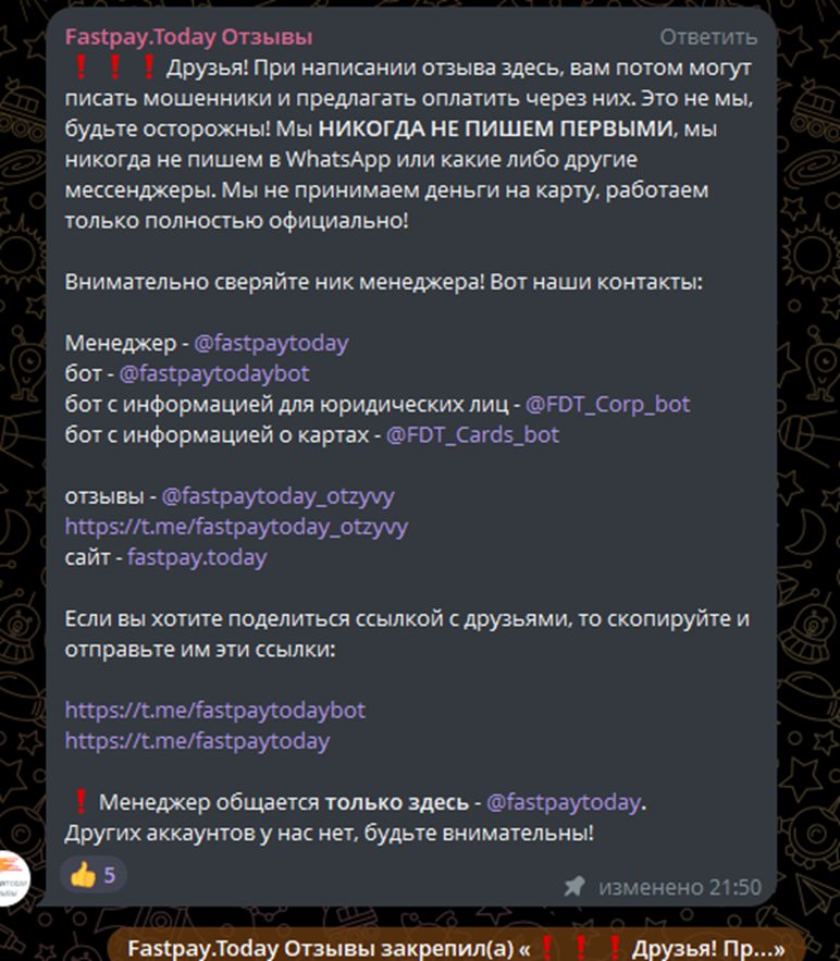 Отзывы о работе Fast Pay Today на внешних ресурсах найти не удалось. Единственные комментарии имеются на сайте и Телеграмм канале платежной системы. Для клиентов доступна отдельная группа Fastpay Today Отзывы (fastpaytoday otzyvy), где любой подписчик может написать свое замечание. Группа приватного типа, доступ предоставляется после одобрения заявки.